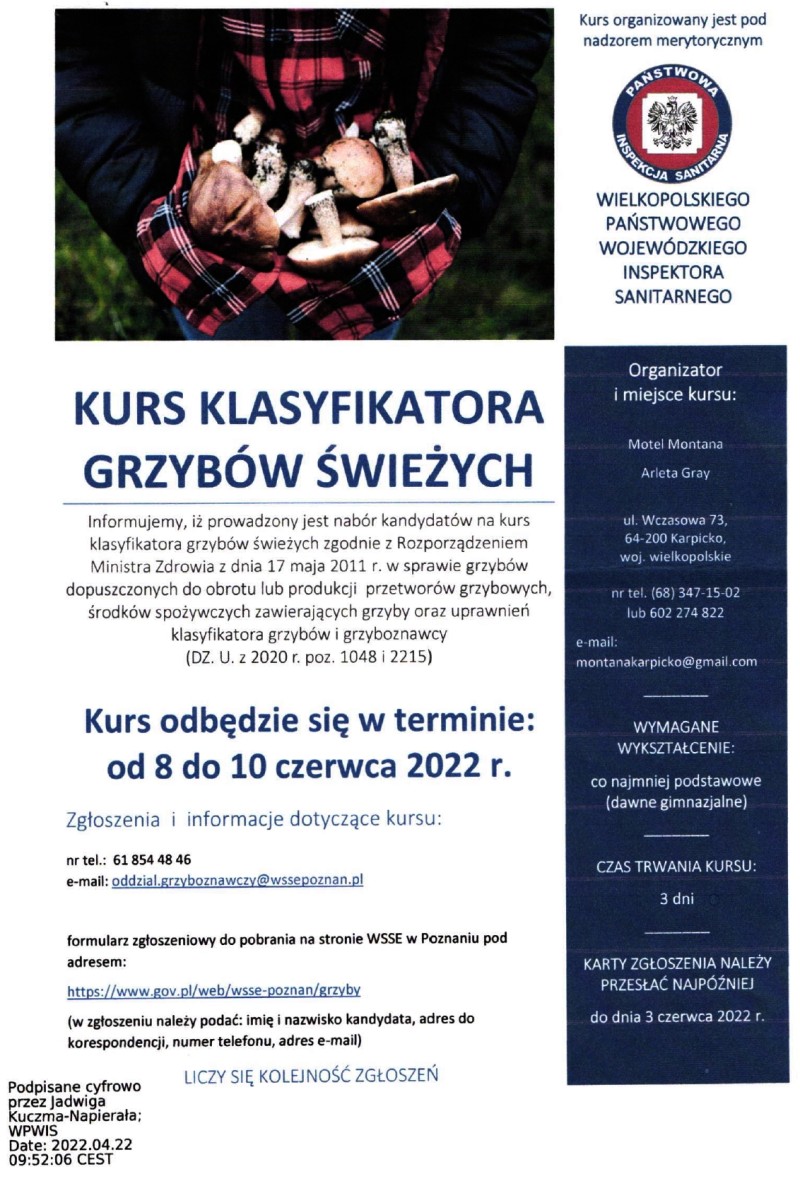 Informujemy, iż prowadzony jest nabór kandydatów na kurs klasyfikatora grzybów świeżych zgodnie z Rozporządzeniem Ministra Zdrowia z dnia 17 maja 2011 r. w sprawie grzybów dopuszczonych do obrotu lub produkcji przetworów grzybowych, środków spożywczych zawierających grzyby oraz uprawnień klasyfikatora grzybów i grzyboznawcy (DZ. U. z 2020 r. poz. 1048 i 2215)