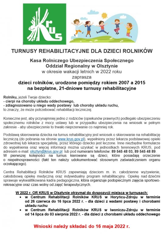 Kasa Rolniczego Ubezpieczenia Społecznego Oddział Regionalny w Olsztynie w okresie wakacji letnich w 2022 roku zaprasza dzieci rolników, urodzone pomiędzy rokiem 2007 a 2015 na bezpłatne, 21-dniowe turnusy rehabilitacyjne.