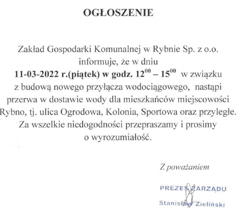 Zakład Gospodarki Komunalnej w Rybnie Sp. z o.o. informuje, że w dniu 11-03-2022 r. (piątek) w godz. 12:00 -15:00 w związku z budową nowego przyłącza wodociągowego, nastąpi przerwa w dostawie wody dla mieszkańców miejscowości Rybno.