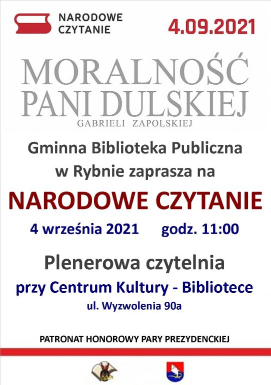 Zapraszamy wszystkich chętnych do udziału w ogólnopolskiej akcji NARODOWE CZYTANIE 2021, która odbędzie się już w najbliższą sobotę 4 września o godzinie 11:00 w plenerowej czytelni przy Centrum Kultury-Bibliotece w Rybnie.