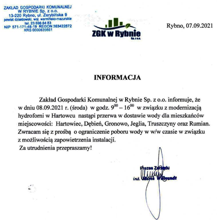 Zakład Gospodarki Komunalnej w Rybnie Sp. z o.o. informuje, że w dniu 08.09.2021 r. (środa) w godz. 9:00-16:00 w związku z modernizacją hydroforni w Hartowcu nastąpi przerwa w dostawie wody dla mieszkańców miejscowości: Hartowiec, Dębień, Gronowo, Jeglia, Truszczyny oraz Rumian.