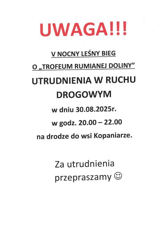 UWAGA!!! W dniu 30.08.2025r. (sobota), w godz. 20:00-22:00 na drodze do wsi Kopaniarze, ze względu na organizację V Nocnego Leśnego Biegu o "Trofeum Rumianej Doliny" będą występowały utrudnienia w ruchu drogowym.