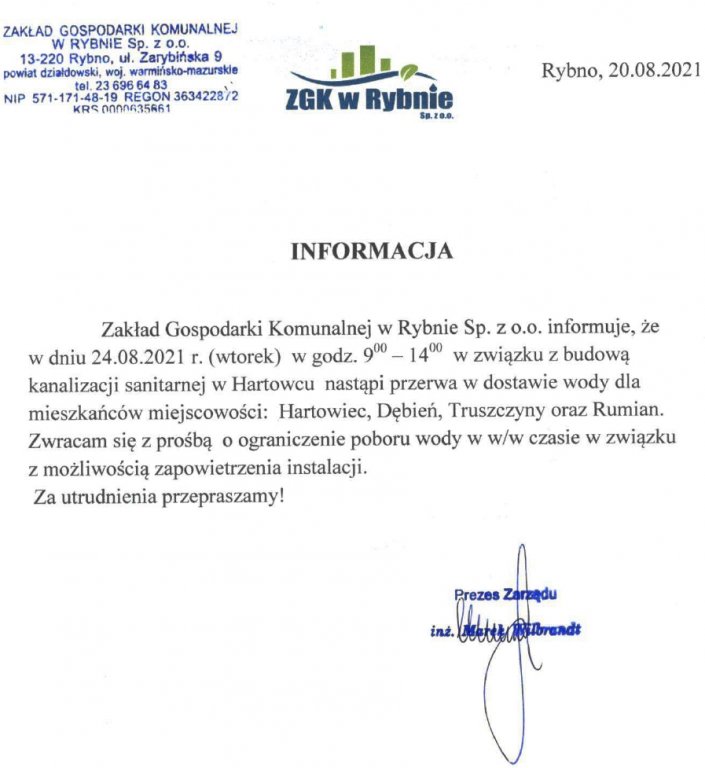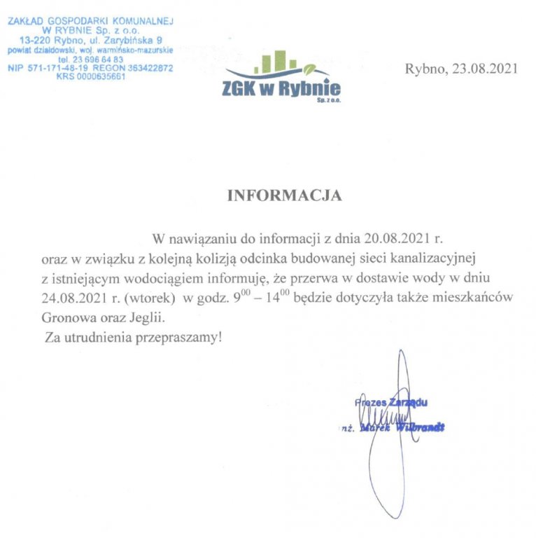 W nawiązaniu do informacji z dnia 20.08.2021 r. oraz w związku z kolejną kolizją odcinka budowanej sieci kanalizacyjnej z istniejącym wodociągiem informuję, że przerwa w dostawie wody w dniu 24.08.2021 r. (wtorek) w godz. 9:00 - 14:00 będzie dotyczyła także mieszkańców Gronowa oraz Jeglii. Za utrudnienia przepraszamy!