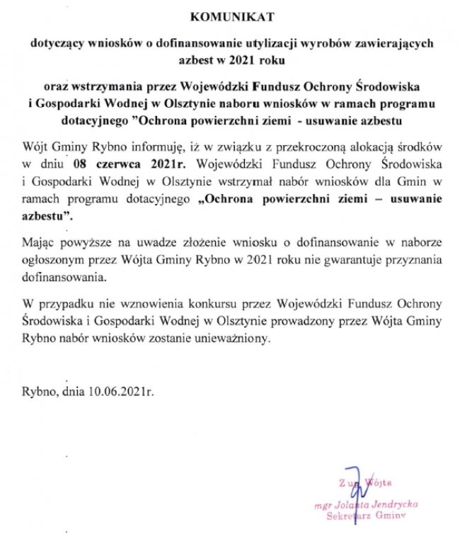 KOMUNIKAT dotyczący wniosków o dofinansowanie utylizacji wyrobów zawierających azbest w 2021 roku oraz wstrzymania przez Wojewódzki Fundusz Ochrony Środowiska i Gospodarki Wodnej w Olsztynie naboru wniosków w ramach programu dotacyjnego "Ochrona powierzchni ziemi - usuwanie azbestu.