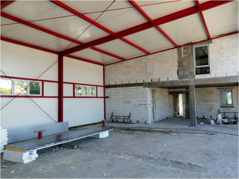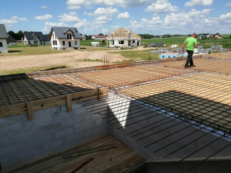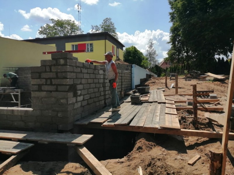 Trwają prace związane z murowaniem ścian piwnic oraz przygotowanie pod wykonanie stropu. Zakończone prace na poziomie gruntu na części niepodpiwniczonej obiektu.