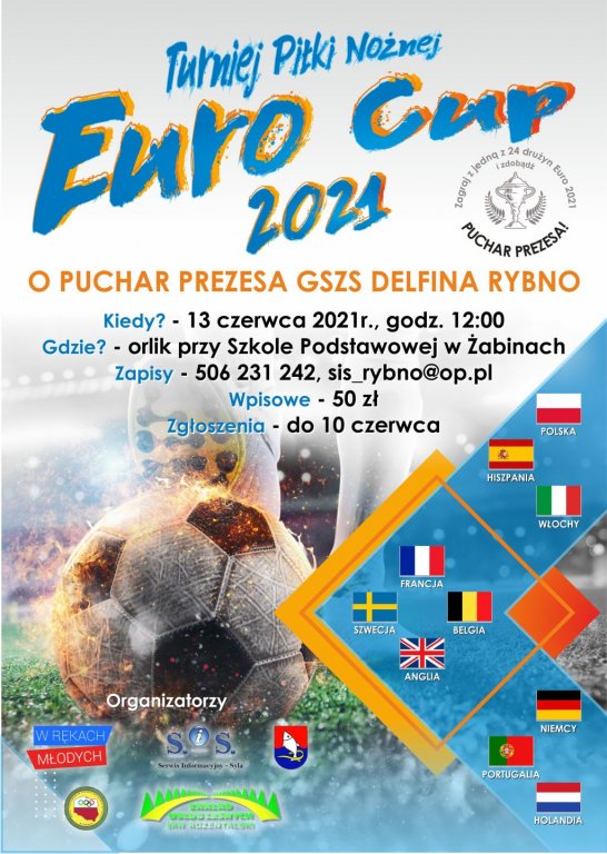 W niedzielę, 13 czerwca 2021r. o godz. 12:00 no orliku przy Szkole Podstawowej im. Polskich Mistrzów Olimpijskich w Żabinach odbędzie się turniej piłki nożnej „EURO CUP 2021” o Puchar Prezesa GSZS Delfina Rybno!