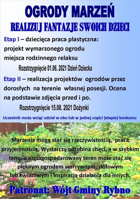 Celem konkursu, któego organizatorem jest Gminna Biblioteka Publiczna w Rybnie jest aktywizacja rodzin z terenu Gminy Rybno w tworzeniu własnych ogrodów.