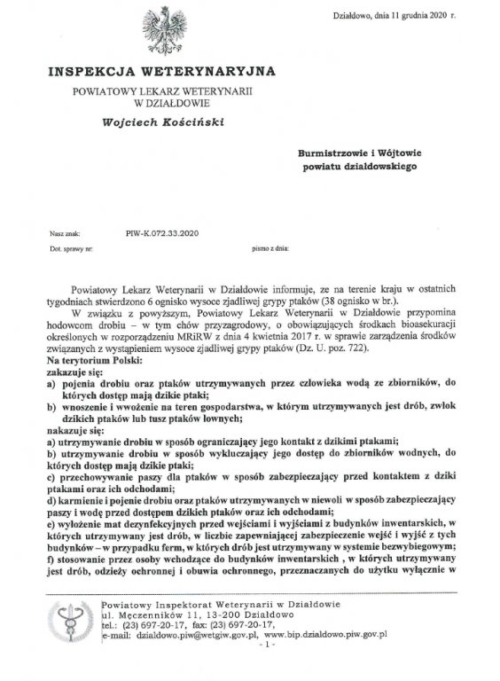 W sobotę 12 grudnia 2020 r. Główny Lekarz Weterynarii otrzymał z PIWet-PIB Puławy dodatnie wyniki badań laboratoryjnych, na podstawie których stwierdzono trzydzieste dziewiąte w 2020 r. i siódme w II półroczu br. ognisko HPAI w gospodarstwie utrzymującym 9162 indyki rzeźne w wieku 12 tygodni.