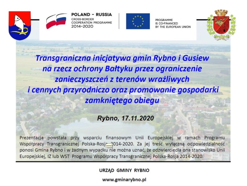 W dniu 17.11.2020 r. odbyła się wideokonferencja otwierająca realizację Projektu pn. „Transgraniczna inicjatywa gm. Rybno i Gusiew na rzecz ochrony Bałtyku przez ograniczenie zanieczyszczeń z terenów wrażliwych i cennych przyrodniczo oraz promowanie gospodarki zamkniętego obiegu”.