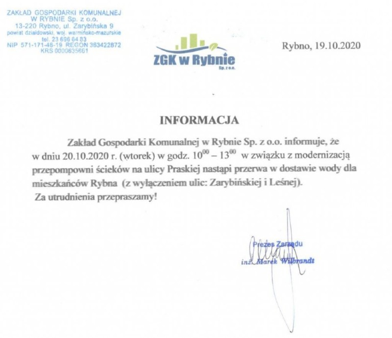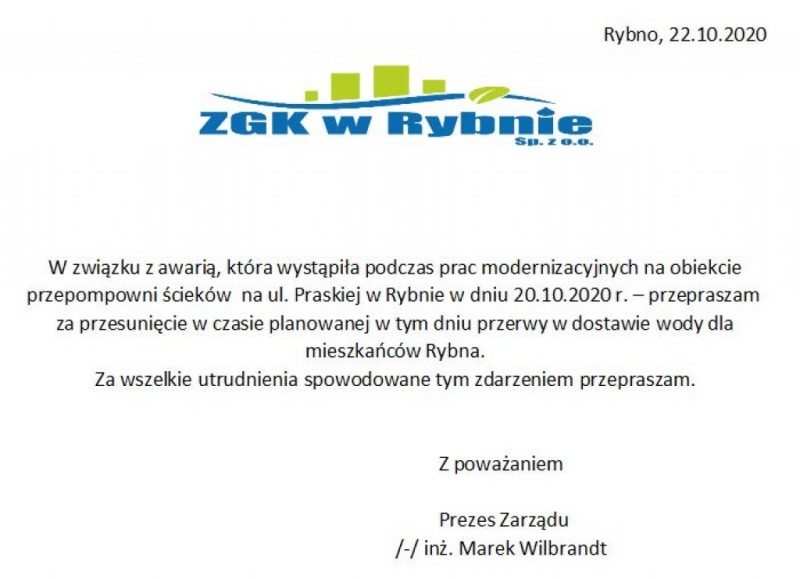 W związku z awarią, która wystąpiła podczas prac modernizacyjnych na obiekcie przepompowni ścieków na ul. Praskiej w Rybnie w dniu 20.10.2020 r. – przepraszam za przesunięcie w czasie planowanej w tym dniu przerwy w dostawie wody dla mieszkańców Rybna.