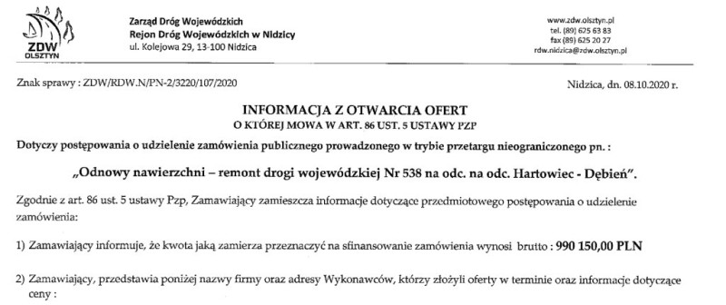 Dnia 08.10.2020r. komisja odbiorowa w składzie: Tomasz Węgrzynowski – Wójt Gminy Rybno, Wiesław Szczawiński – koordynator UG Rybno, Henryk Wiśniewski – Sołtys Sołectwa Rybno, Leszek Rolka – mieszkaniec ul. Nowomiejskiej w obecności przedstawiciela ZGK w Rybnie dokonała odbioru i przekazała drogę do użytkowania.