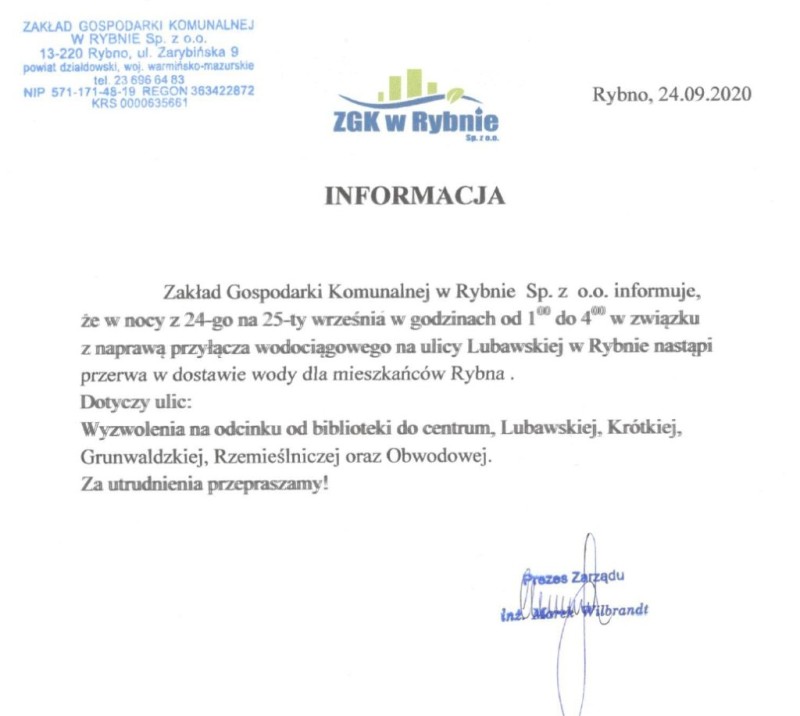 Zakład Gospodarki Komunalnej w Rybnie Sp. z o.o. informuje, że w nocy z 24-go na 25-ty września w godzinach od 1:00 do 4:00 w związku z naprawą przyłącza wodociągowego na ulicy Lubawskiej w Rybnie nastąpi przerwa w dostawie wody dla mieszkańców Rybna.