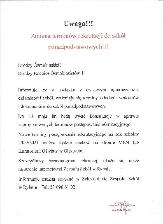 Drodzy Ósmoklasiści, Drodzy Rodzice ósmoklasistów!!! Informuję, że w związku z czasowym ograniczeniem działalności szkół, zmieniają się terminy składania wniosków i dokumentów do szkół ponadpodstawowych.
