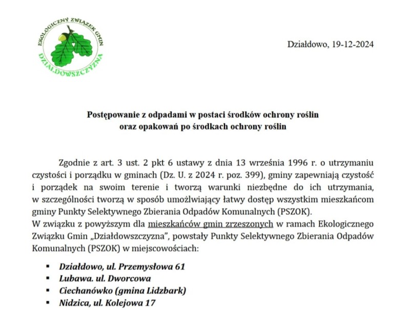 Zgodnie z art. 3 ust. 2 pkt 6 ustawy z dnia 13 września 1996 r. o utrzymaniu czystości i porządku w gminach (Dz. U. z 2024 r. poz. 399), gminy zapewniają czystość i porządek na swoim terenie i tworzą warunki niezbędne do ich utrzymania, w szczególności tworzą w sposób umożlwiający łatwy dostęp wszystkim mieszkańcom gminy Punkty Selektywnego Zbierania Odpadów Komunalnych (PSZOK).