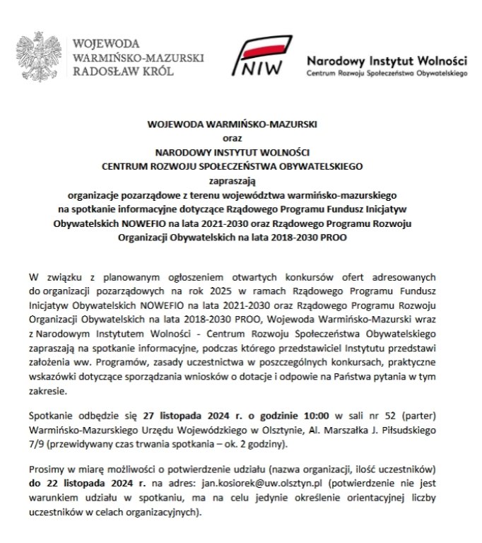 W związku z planowanym ogłoszeniem otwartych konkursów ofert adresowanych do organizacji pozarządowych na rok 2025 w ramach Rządowego Programu Fundusz Inicjatyw Obywatelskich NOWEFIO na lata 2021-2030 oraz Rządowego Programu Rozwoju Organizacji Obywatelskich na lata 2018-2030 PROO, Wojewoda Warmińsko-Mazurski wraz z Narodowym Instytutem Wolności - Centrum Rozwoju Społeczeństwa Obywatelskiego zapraszają na spotkanie informacyjne, podczas którego przedstawiciel Instytutu przedstawi założenia ww. Programów, zasady uczestnictwa w poszczególnych konkursach, praktyczne wskazówki dotyczące sporządzania wniosków o dotacje i odpowie na Państwa pytania w tym zakresie.