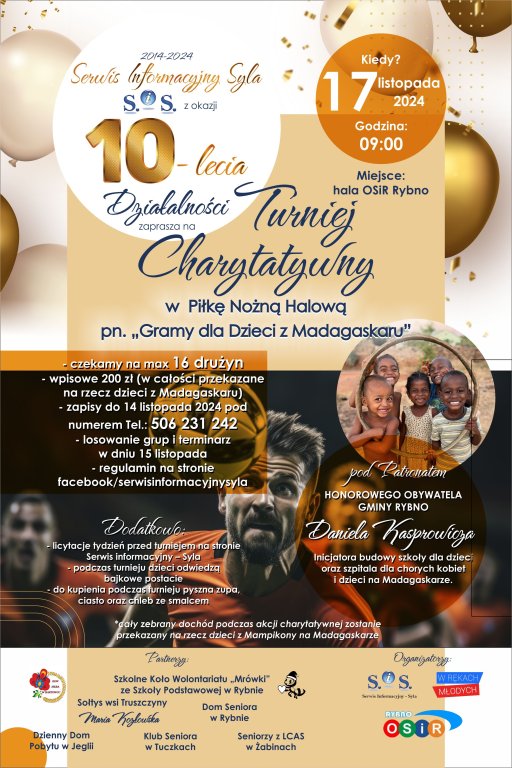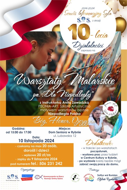 Serwisu Informacyjny Syla, serdecznie zaprasza na wyjątkowe Warsztaty Malarskie „Dla Niepodległej”, które odbędą się 10 listopada 2024 roku w Domu Seniora w Rybnie. Wydarzenie organizowane z okazji 10-lecia działalności serwisu skierowane jest zarówno do dorosłych, jak i dzieci, a jego celem jest uczczenie rocznicy odzyskania przez Polskę niepodległości poprzez artystyczną ekspresję.