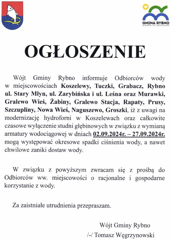 Wójt Gminy Rybno informuje Odbiorców wody w miejscowościach Koszelewy, Tuczki, Grabacz, Rybno ul. Stary Młyn, ul. Zarybińska i ul. Leśna oraz Murawki, Gralewo Wieś, Żabiny, Gralewo Stacja, Rapaty, Prusy, Szczupliny, Nowa Wieś, Naguszewo, Groszki, iż z uwagi na modernizację hydroforni w Koszelewach oraz całkowite czasowe wyłączenie studni głębinowych w związku z wymianą armatury wodociągowej w dniach 02.09.2024r. — 27.09.2024r. mogą występować okresowe spadki ciśnienia wody, a nawet chwilowe zaniki dostaw wody.