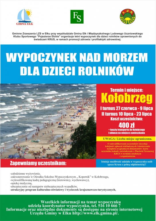 Gminne Zrzeszenie LZS w Ełku przy współudziale z Gminą Ełk organizuje kolonie dla dzieci rolników. Wypoczynek odbędzie się nad morzem w Ośrodku Szkolno-Wypoczynkowym „Kopernik” w Kołobrzegu, przy ul. Łopuskiego 37/39, 42/44. Pierwszy turnus odbędzie się w terminie od 27 czerwca 2016 do 9 lipca 2016, a drugi od 10 lipca 2016 do 24 lipca 2016.