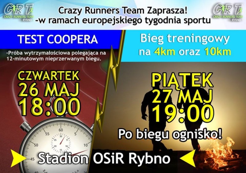 Z okazji Europejskiego Tygodnia Sportu grupa biegaczy – Crazy Runners Team Rybno w porozumieniu z kierownik Ośrodka Sportu i Rekreacji w Rybnie – Hanną Bem, organizują 26 maja o godz. 18:00 na stadionie sportowym w Rybnie – Test Coopera.
