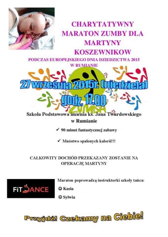 Bardzo serdecznie chciałabym zaprosić na Charytatywny Maraton Zumby dla Martyny Koszewnikow z Działdowa, który odbędzie się 27 września o godzinie 17:00 w Szkole Podstawowej w Rumianie.