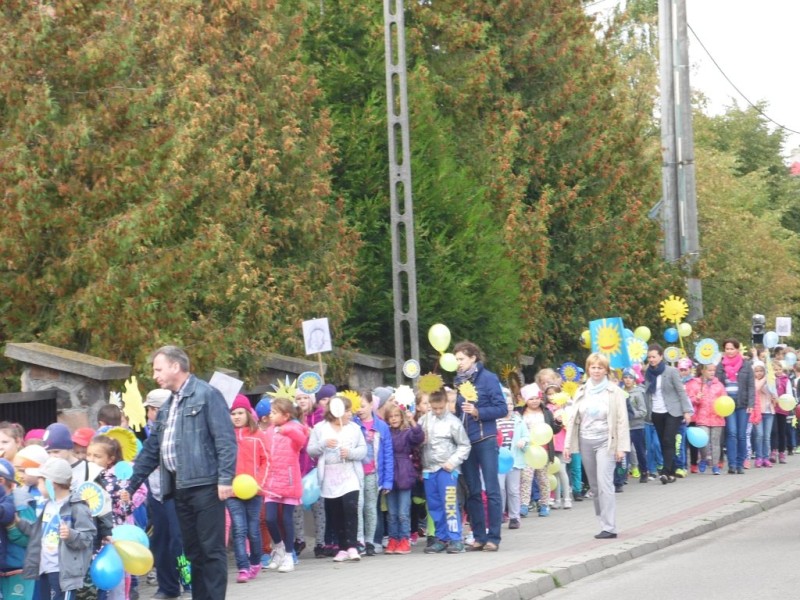 W dniu 22 IX 2015 r. o godz. 10 nasza szkoła wyruszyła ulicami Rybna Słonecznym Korowodem ze „słoneczkami”, transparentami, żółtymi i niebieskimi balonikami, a także uśmiechami na twarzy.
