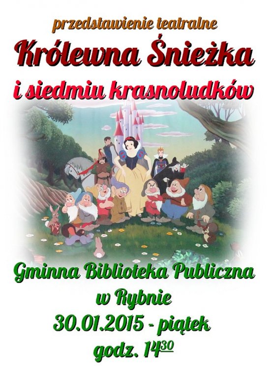 W najbliższy piątek (30.01.2015) w Gminnej Bibliotece Publicznej w Rybnie będzie można zobaczyć przedstawienie zatytułowane "Królewna Śnieżka i siedmiu krasnoludków". Spektakl rozpocznie się o godzinie 14:30.
