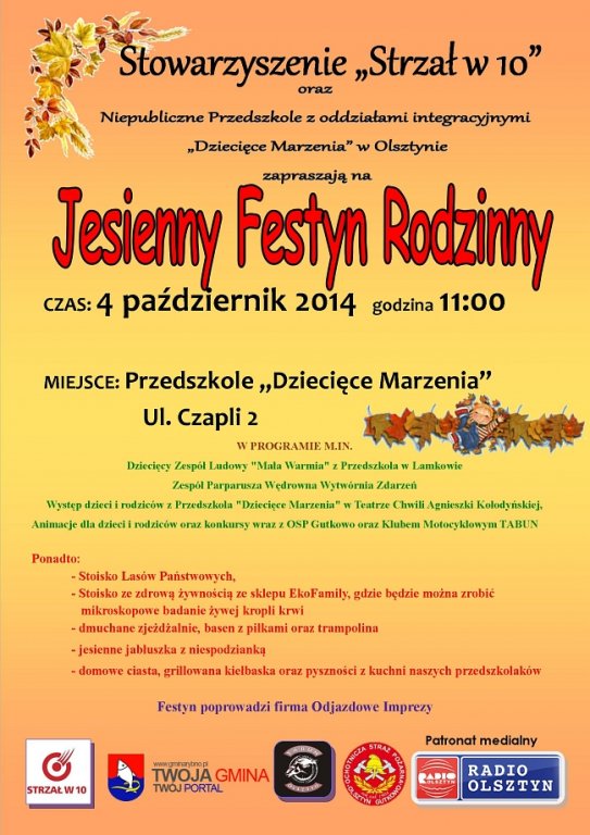 Stowarzyszenie Rodzin i Przyjaciół Osób z Zespołem Downa oraz Niepubliczne Przedszkole "Dziecięce Marzenia" w Olsztynie zapraszają do udziału w Jesiennym Festynie Rodzinnym.