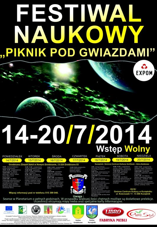 Obserwacje nieba przez największe w Polsce teleskopy, planetarium, miniatura Układu Słonecznego, bezpłatne mapy nieba i pocztówki dla każdego to tylko niektóre atrakcje Festiwalu Naukowego „Piknik pod Gwiazdami”, który w dniach od 14 do 20 lipca 2014 r. odbywa się w Nowym Grodzicznie i Kurzętniku.