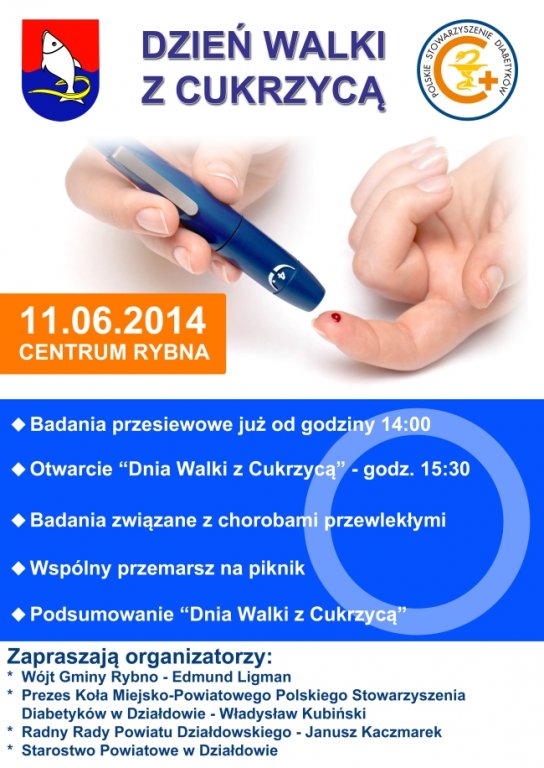 Wójt Gminy Rybno Edmund Ligman, Prezes Koła Miejsko Powiatowego Polskiego Stowarzyszenia Diabetyków w Działdowie Władysław Kubiński, Radny Rady Powiatu Działdowskiego Janusz Kaczmarek oraz Starostwo Powiatowe w Działdowie zapraszają na "Dzień walki z cukrzycą na terenie Gminy Rybno".