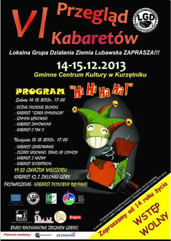 Lokalna Grupa Działania Ziemia Lubawska wraz z partnerami Stowarzyszeniem Rozwoju Gminy Kurzętnik oraz Kaczym Bagnem – Miejscem Inicjatyw Pozytywnych serdecznie zapraszają do uczestnictwa w VI PRZEGLĄDZIE KABARETÓW „HIHIHAHA!”.