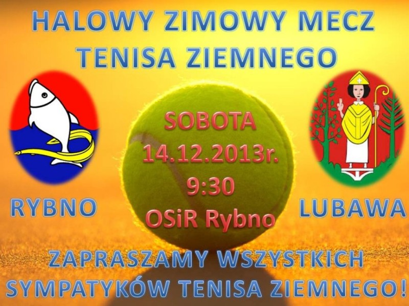 Serdecznie zapraszamy na mecz tenisa ziemnego, pomiędzy reprezentantami Rybna i Lubawy, do którego dojdzie dnia 14 grudnia o godz. 9.30 w hali Ośrodka Sportu i Rekreacji w Rybnie.