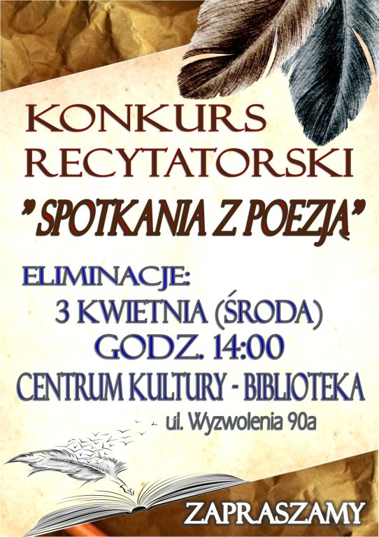 Gminna Biblioteka Publiczna w Rybnie zaprasza uczniów szkół podstawowych z terenu Gminy Rybno do wzięcia udziału w Konkursie recytatorskim „Spotkania z Poezją”.