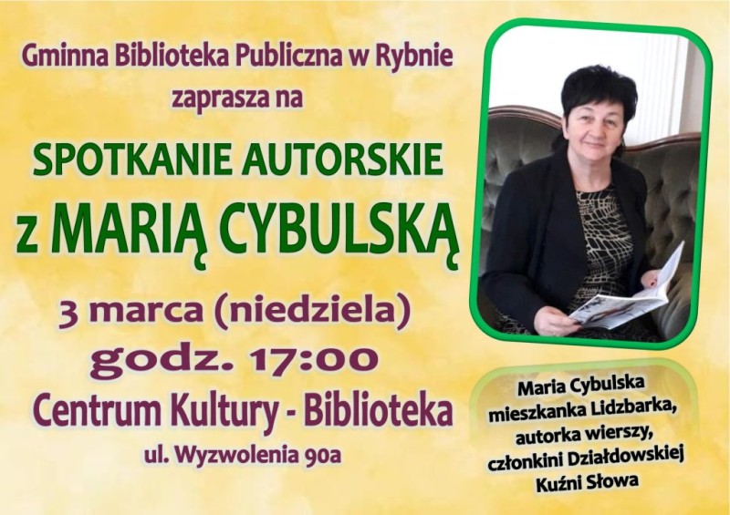 Gminna Biblioteka Publiczna w Rybnie zaprasza na spotkanie autorskie z Marią Cybulską - autorką wierszy, członkinią Działdowskiej Kuźni Słowa, które odbędzie się w niedziele 3 marca o godz. 17:00.