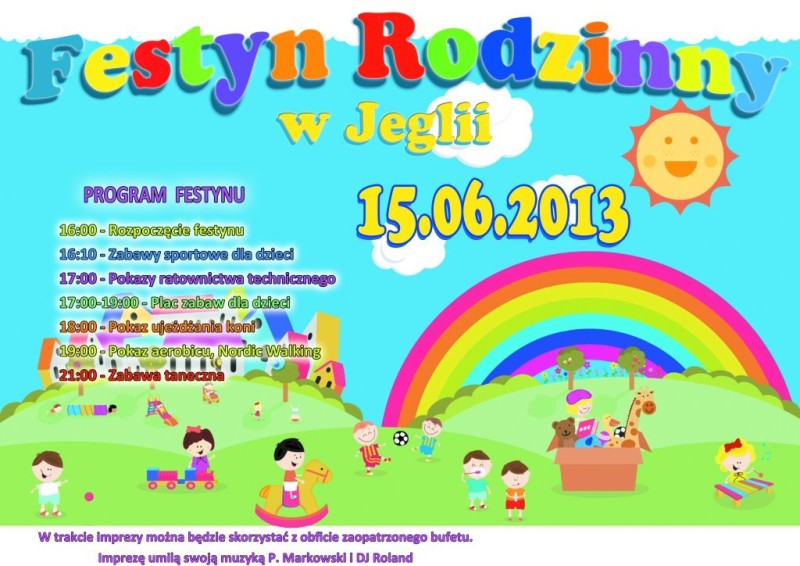W najbliższą sobotę (15.06.2013) w Jeglii odbędzie się Festyn Rodzinny organizowany przez Radę Sołecką, Nauczycieli ze Szkoły Podstawowej w Jeglii, Radnego Rady Gminy Rybno Leszka Zakrzewskiego oraz miejscową Ochotniczą Straż Pożarną.