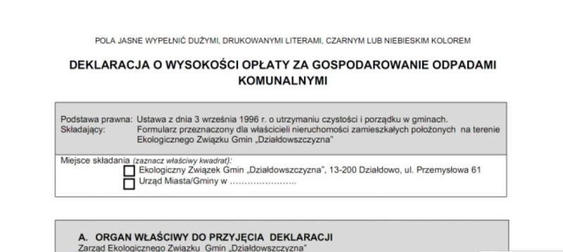 Przypominamy, że dnia 25 kwietnia bieżącego roku upływa ostateczny termin złożenia deklaracji o wysokości opłaty za gospodarowanie odpadami komunalnymi.