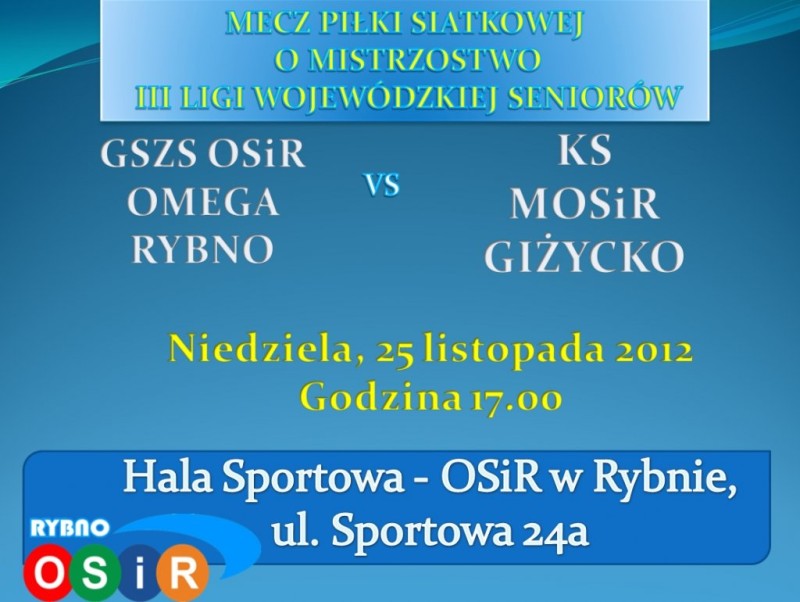 W najbliższą niedzielę, 25 listopada 2012 r. w hali sportowej Ośrodka Sportu i Rekreacji w Rybnie odbędzie się mecz piłki siatkowej o mistrzostwo III Ligi Wojewódzkiej Seniorów. Na parkiecie zmierzą się GSZS OSiR "Omega" Rybno oraz KS MOSiR Giżycko.
