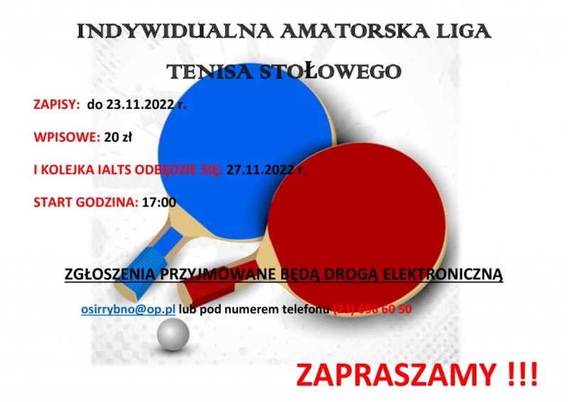Do 23 listopada 2022r. w hali Ośrodka Sportu i Rekreacji w Rybnie można się do kolejnej edycji Indywidualnej Amatorskiej Ligi Tenisa Stołowego. Pierwsza kolejka zaplanowana jest na 27 listopada na godz. 17:00. Wpisowe 20 zł. Regulamin już niebawem na stronie organizatora.