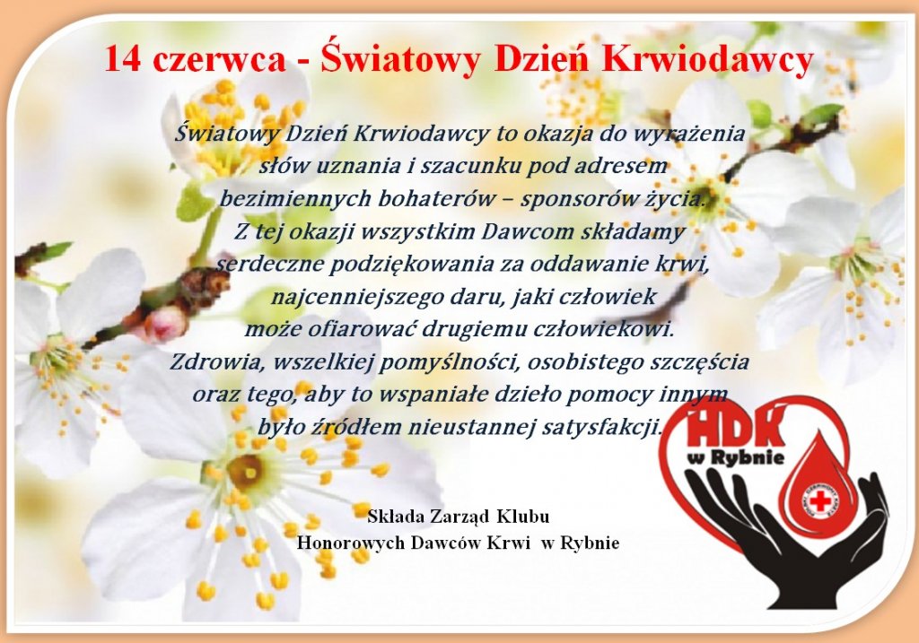 Z tej okazji wszystkim Dawcom składamy serdeczne podziękowania za oddawanie krwi, najcenniejszego daru, jaki człowiek może ofiarować drugiemu człowiekowi. Zdrowia, wszelkiej pomyślności, osobistego szczęścia oraz tego, aby to wspaniałe dzieło pomocy innym było źródłem nieustannej satysfakcji.