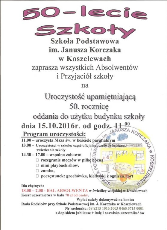 Szkoła Podstawowa im. Janusza Korczaka w Koszelewach zaprasza wszystkich Absolwentów i Przyjaciół szkoły do udziału w uroczystości upamiętniającej 50 rocznicę oddania do użytku budynku szkoły.