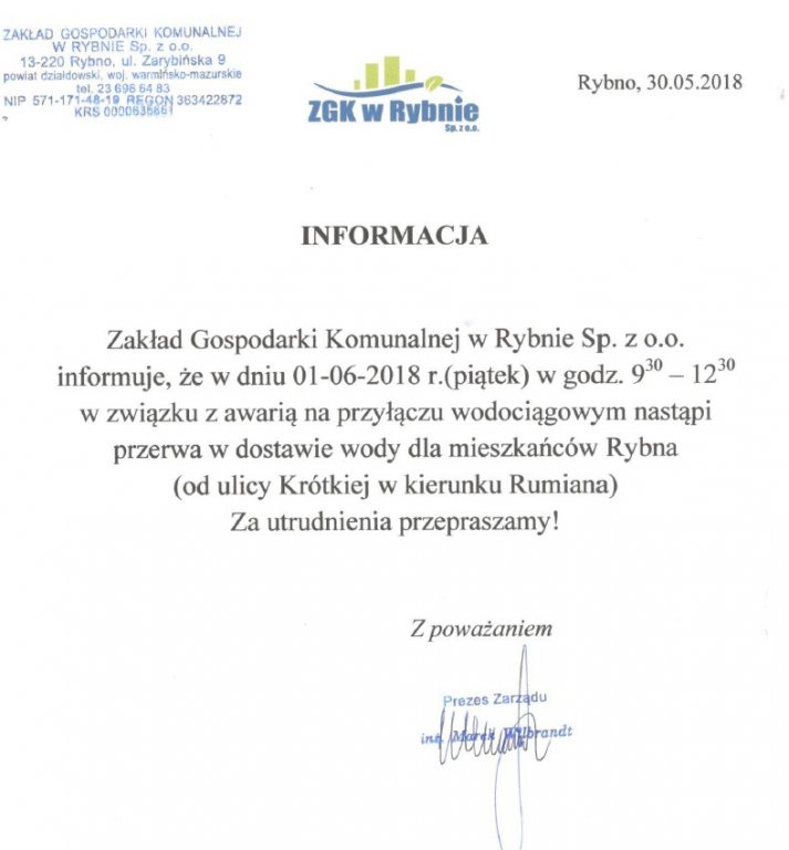 Uwaga mieszkańcy Rybna! Jak informuje Zakład Gospodarki Komunalnej w Rybnie sp. z o. o. w dniu 1 czerwca 2018 r. (piątek) następi przerwa w dostawie wody.