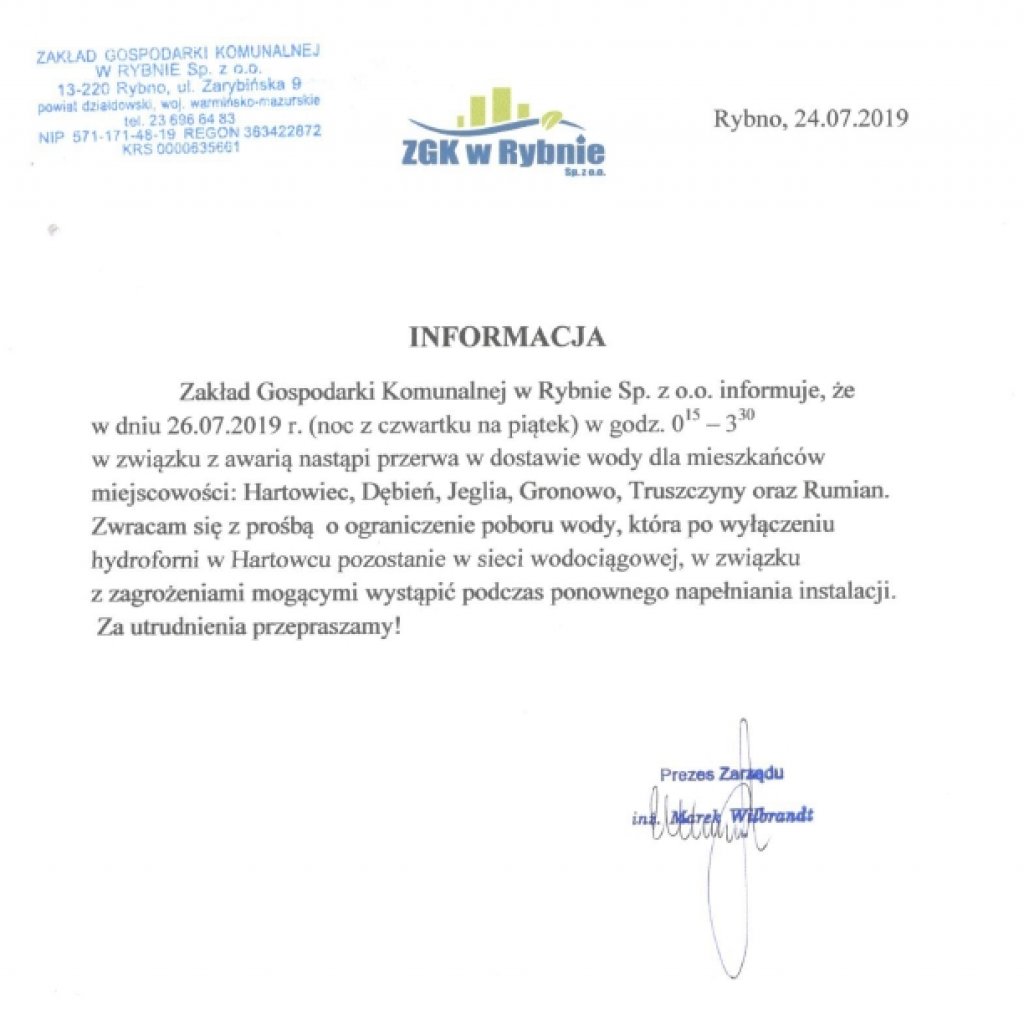Zakład Gospodarki Komunalnej w Rybnie Sp. z o.o. informuje, że w dniu 26.07.2019 r. (noc z czwartku na piątek) w godz. od 0:15 do 03:30 w związku z awarią nastąpi przerwa w dostawie wody dla mieszkańców miejscowości: Hartowiec, Dębień, Jeglia, Gronowo, Truszczyny oraz Rumian.