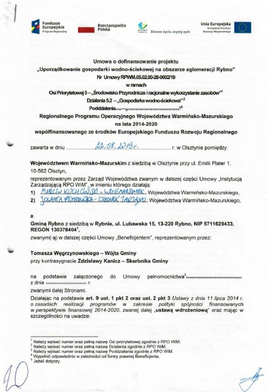 Dnia 22.08.2019 r. w Urzędzie Marszałkowskim województwa warmińsko-mazurskiego w Olsztynie Wójt Gminy Rybno Tomasz Węgrzynowski wraz ze Skarbnik Gminy Zdzisławą Kanicz podpisali umowę na dofinansowanie ze środków Unii Europejskiej projektu pn.: „Uporządkowanie gospodarki wodno-ściekowej na obszarze aglomeracji Rybno”.