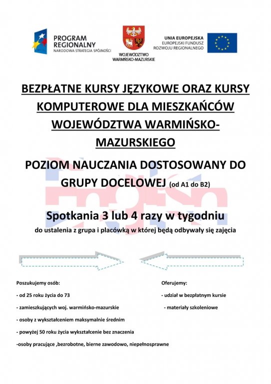 Kursy organizowane są przez Akademię Języków Obcych Easy English. Kursy przeznaczone są dla mieszkańców województwa warmińsko-mazurskiego. Udział w nich brać mogą zarówno osoby pracujące, bezrobotne, jak i bierne zawodowo, z wykształceniem maksymalnie średnim. Wyjątkiem są osoby w wieku 50+, w przypadku których wykształcenie wyższe nie jest przeszkodą. Zapraszamy do udziału wszystkie osoby zainteresowane, będące w wieku od 25 do 73 roku życia. Aby kurs mógł wystartować konieczne jest zebranie 12-osobowej grupy.