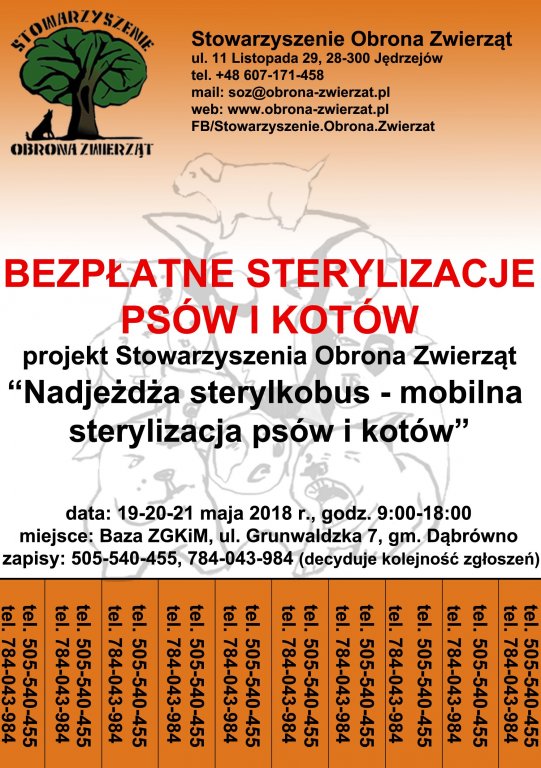 Stowarzyszenie Obrona Zwierząt, KRS 0000292939, uprzejmie informuje, iż w dniach 19/20/21 maja 2018 r., na terenie bazy ZGKiM Gminy Dąbrówno, organizuje akcję kastracji psów i kotów. Odbywać się ona będzie w ramach projektu Stowarzyszenia "Nadjeżdża sterylkobus - mobilna sterylizacja psów i kotów"