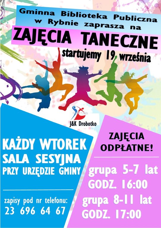 - Zajęcia taneczne - pierwsze spotkanie we wtorek 19.09.2023r. o godzinie 14:00 (dla dzieci w wieku 6-8 lat) oraz o godzinie 17:00 (dla dzieci w wieku 9 - 11 lat)