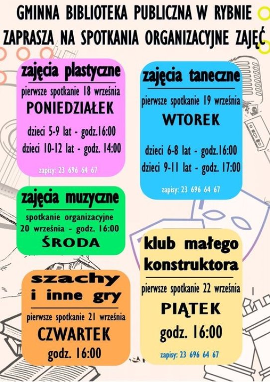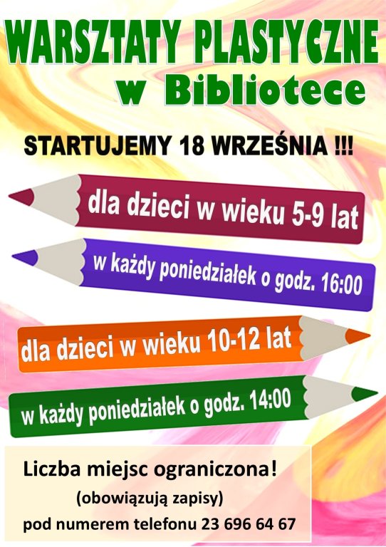 - Zajęcia plastyczne - pierwsze spotkanie w poniedziałek 18.09.2023r. o godzinie 14:00 (dla dzieci w wieku 10-12 lat) oraz o godzinie 16:00 (dla dzieci w wieku 5 - 9lat)