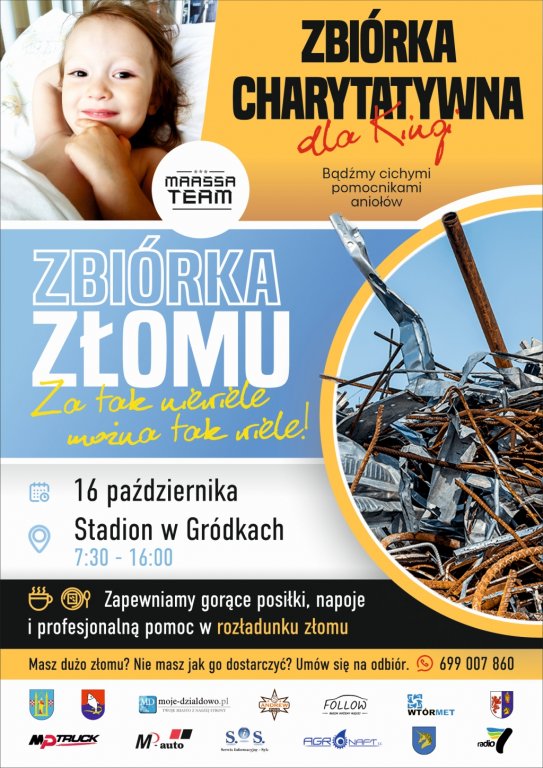W sobotę, 16 października 2021r. w godz. 7:30-16:00 na stadionie w Gródkach odbędzie się kolejna akcja charytatywna dla chorej na guza mózgu Kingi. Tym razem organizatorzy zrzutki zapraszają na zbiórkę złomu.