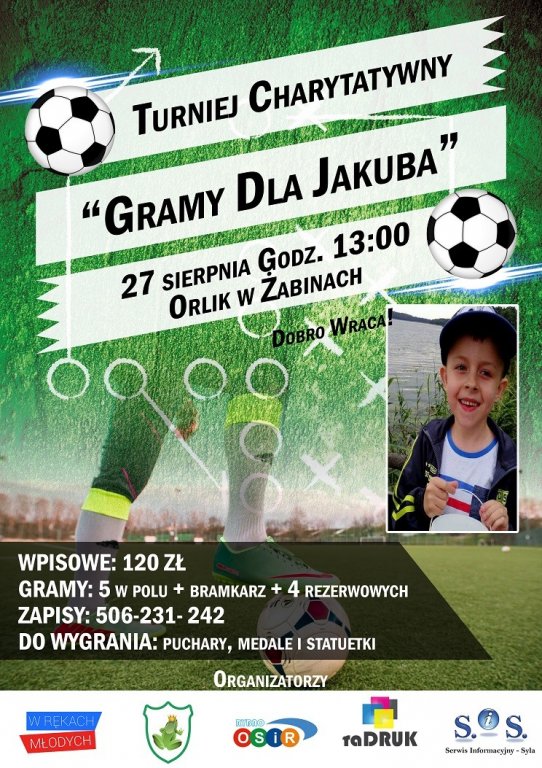 W niedzielę, 27 sierpnia o godz. 13:00 na orliku w Żabinach odbędzie się Charytatywny Turniej Piłki Nożnej na zakończenie wakacji „Gramy dla Jakuba”.