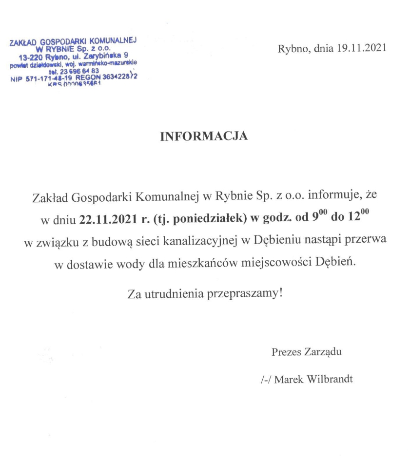 Zakład Gospodarki Komunalnej w Rybnie Sp. z o.o. informuje, że w dniu 22.11.2021 r. (tj. poniedziałek) w godz. od 9:00 do 12:00 w związku z budową sieci kanalizacyjnej w Dębieniu nastąpi przerwa w dostawie wody dla mieszkańców miejscowości Dębień.
