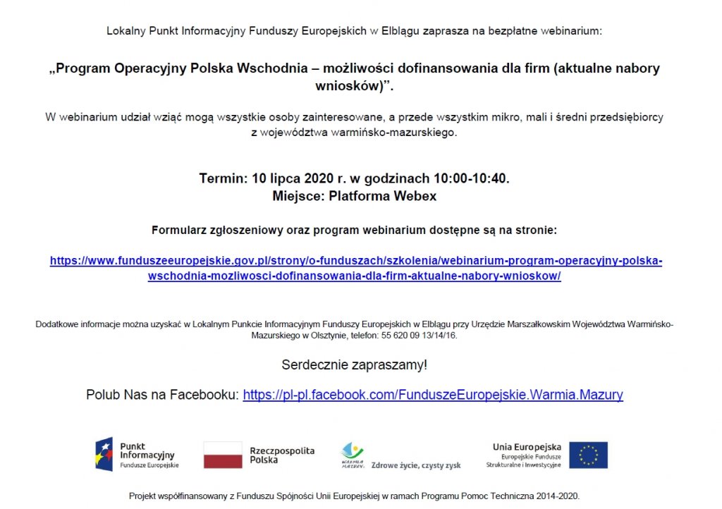 Lokalny Punkt Informacyjny Funduszy Europejskich w Elblągu zaprasza na bezpłatne webinarium: „Program Operacyjny Polska Wschodnia – możliwości dofinansowania dla firm (aktualne nabory wniosków)”.
